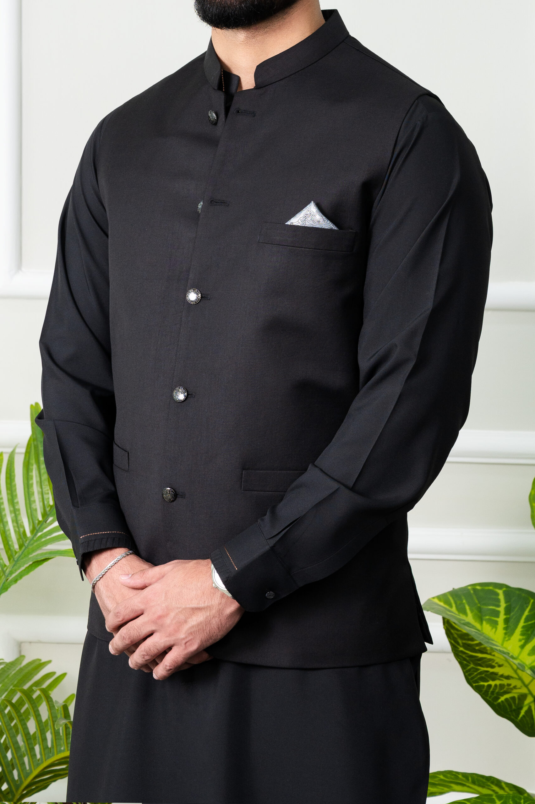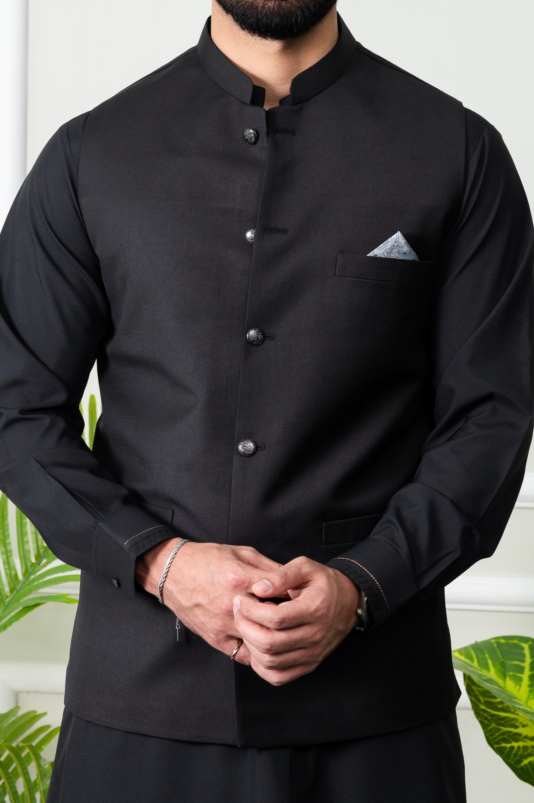 | This Jet Black Textured Waistcoat features premium engraved metallic buttons, a refined band collar, and an elegant patterned pocket square perfect for weddings, festive celebrations, and elevated formal wear. |