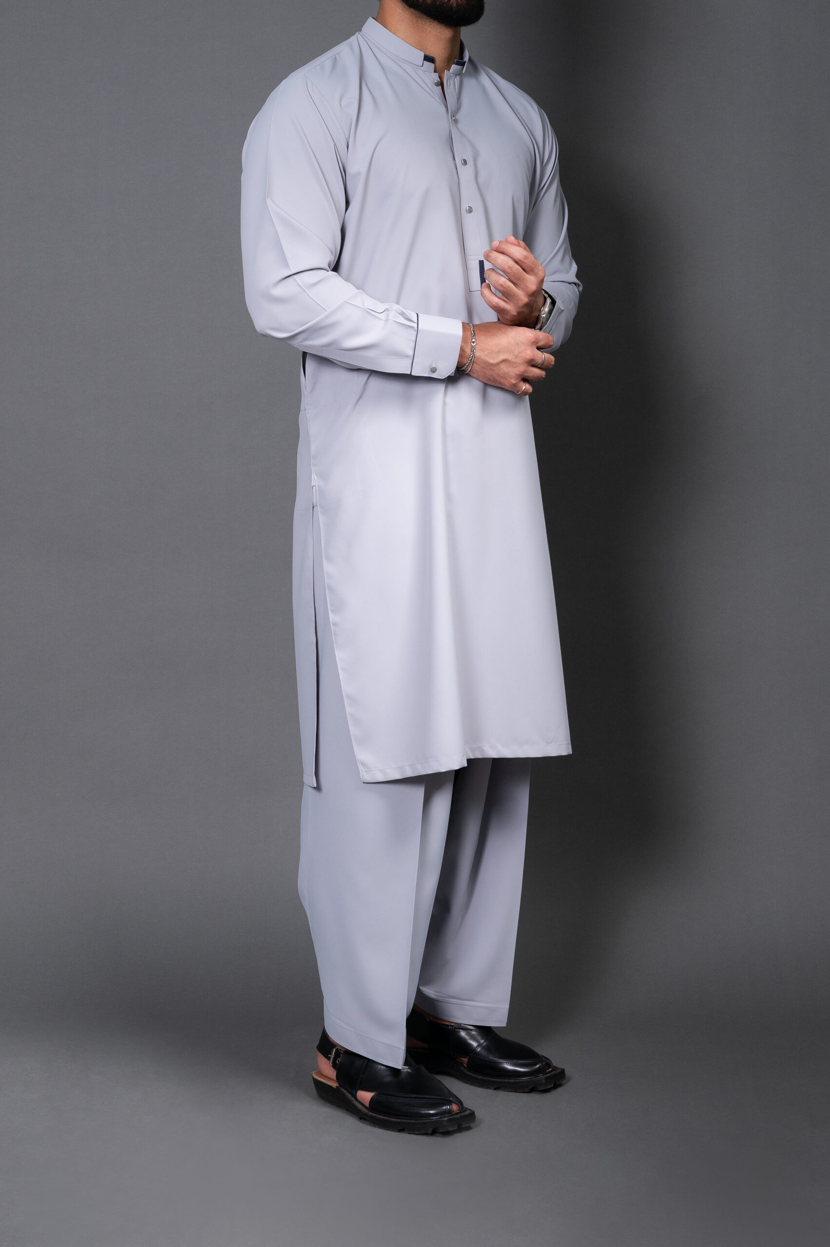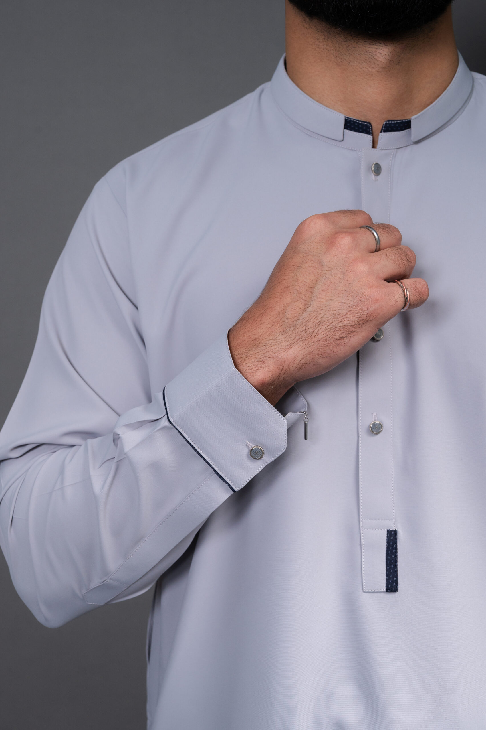 | This Soft Grey Blended Kurta features a modern band collar, elegant navy contrast detailing, and premium cufflink-style buttons—offering a polished, refined look perfect for festive occasions, formal gatherings, and sophisticated everyday wear. |